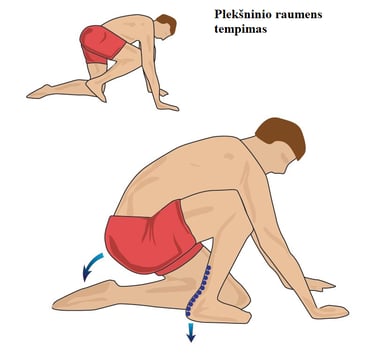 Antru atveju tempiame plekšninį raumenį taip: viena koja sėdame ant kulno, kitos kojos pėdą pastatome prie pat sulenktosios kojos kelio. Tuomet svyrame su visu kūnu į priekį kol pradedame jausti tempimą blauzdoje (gali jaustis veržimas ties čiurnos priekiu, tai normalu).
