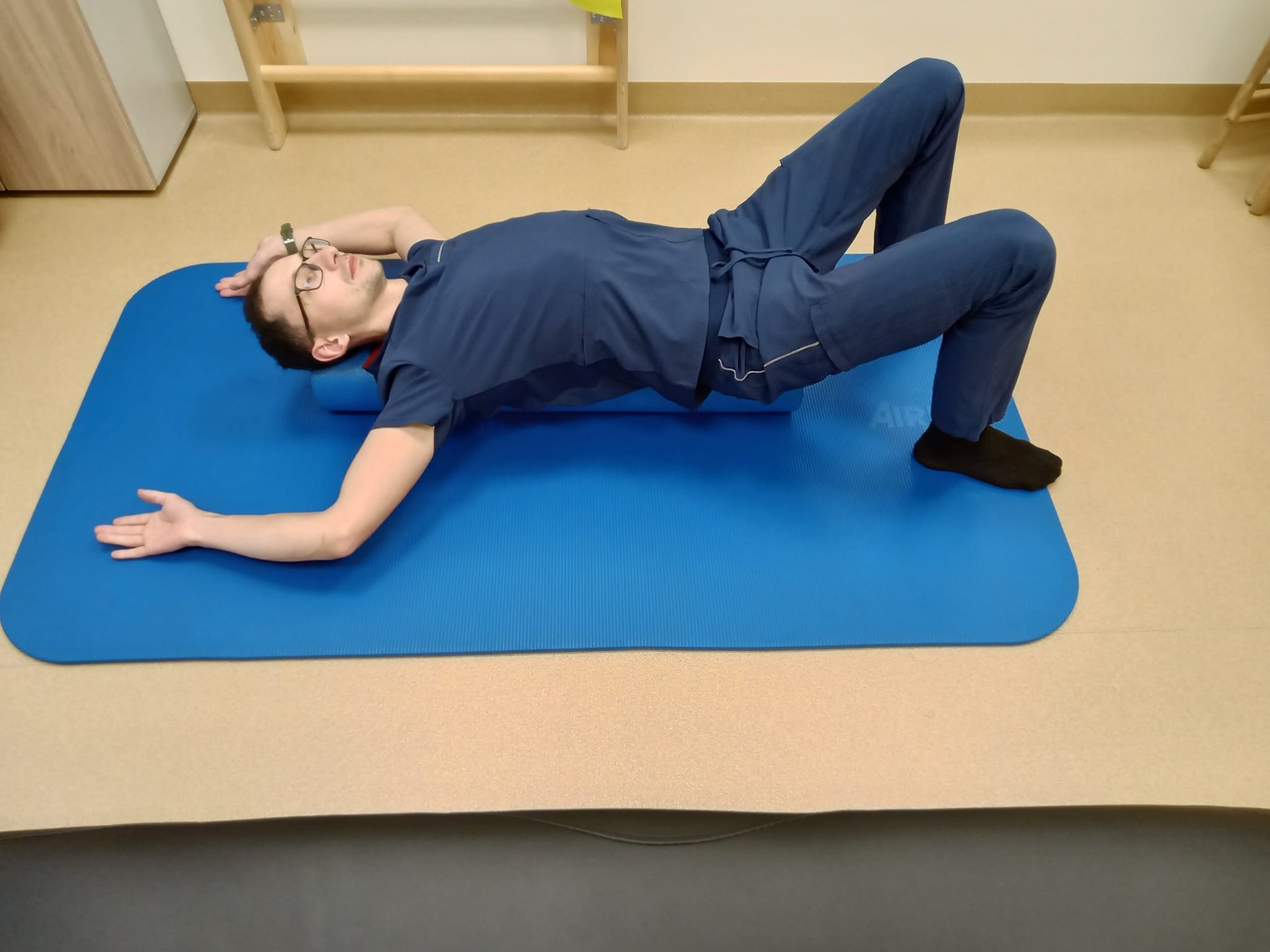 Atsigulame ant volo išilgai taip, kad pasidėtų pakaušis ir kryžkaulis;